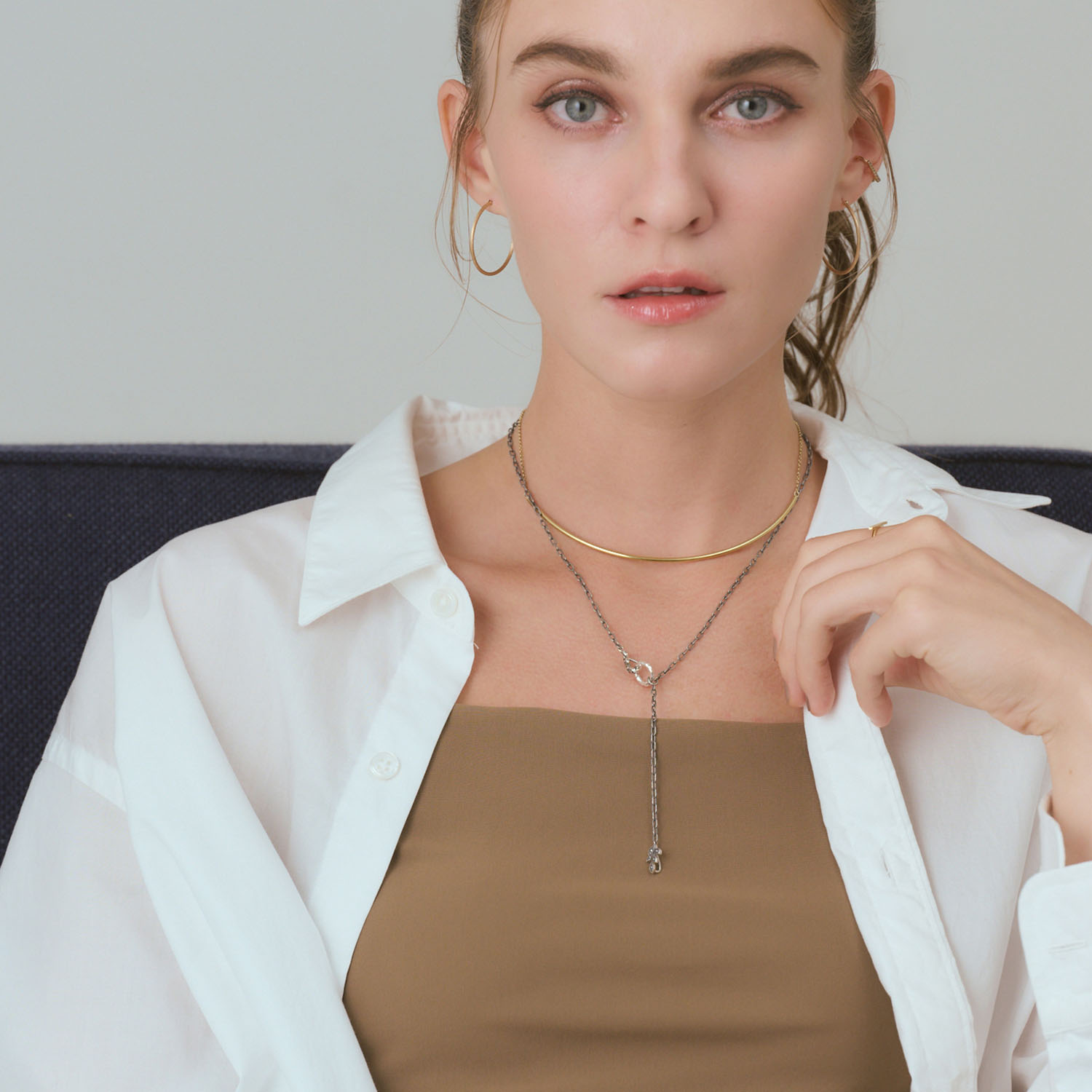 以双侧轻柔环绕的卡扣设计呈现。古美工艺与复古风格交织出优雅氛围。既可搭配多枚吊坠进行佩戴,