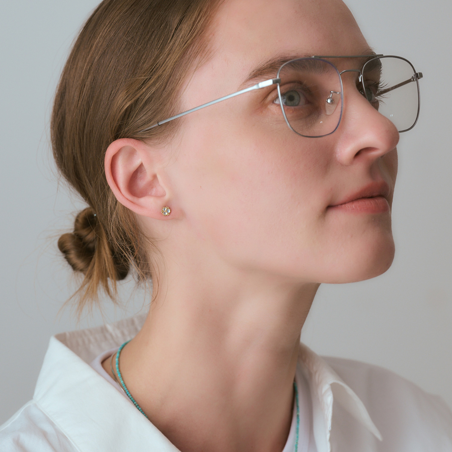 【拉长石】柔和的白色拉长石闪耀着优雅光芒,为面部轮廓增添高雅韵致。